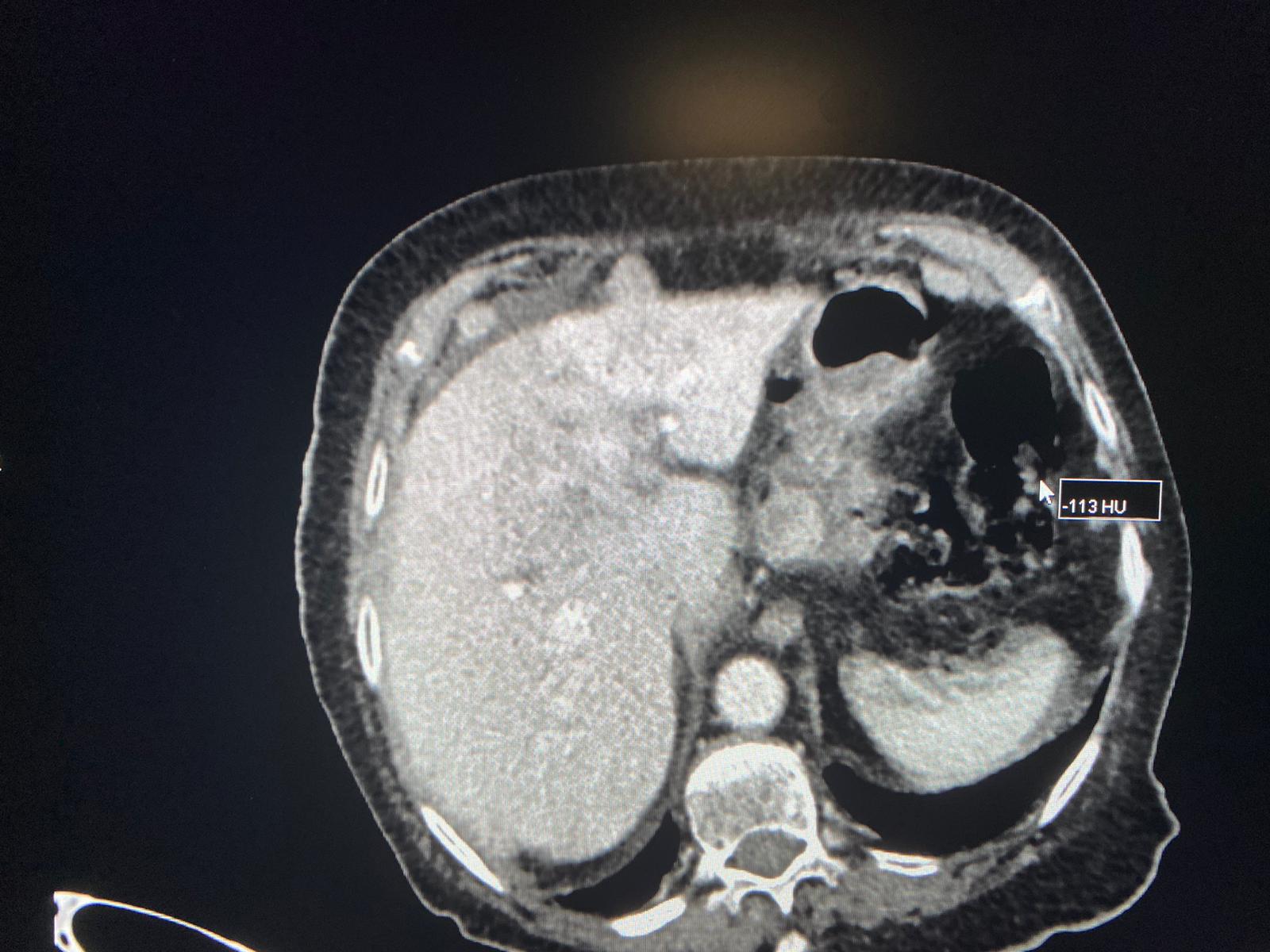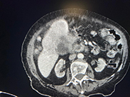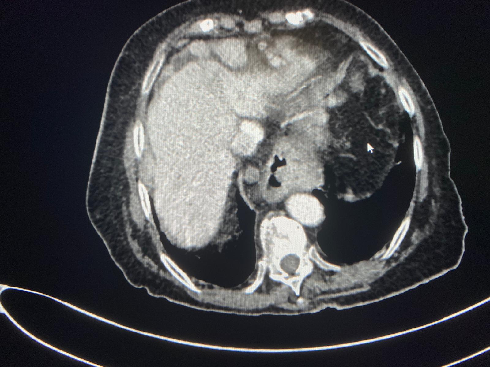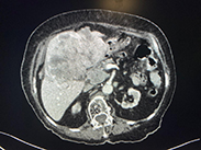 Llaman por sospecha de colecisitis en mujer de 95 años. Se hace el TC y vemos una gran masa heterogènea hepática, que condiciona dilatación de via biliar intra y extra, junto con múltiples implantes perihepàticos, periportales, periesofágicos, intrapelvicos… Se sospecha de colangiocarcinoma, menos probable hepatocarcinoma. |