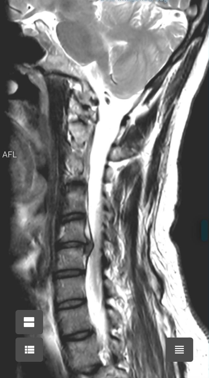 En C5-C6 cambios degenerativos con complejo disco osteofitario que condiciona estenosis moderada del canal raquídeo cervical, apreciando signos de mielopatía compresiva. Estenosis foraminal bilateral moderada en C5-C6 e izquierda leve en C6-C7 |