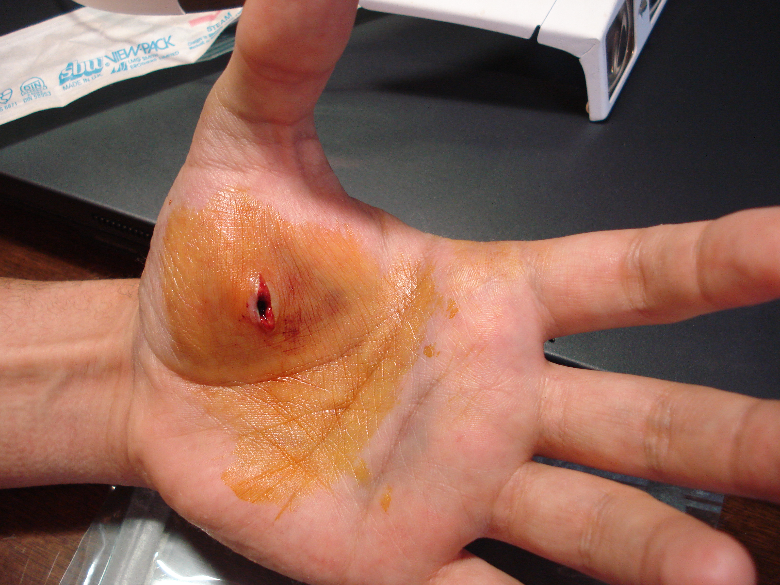 Herida incisa en la mano por cristal. |