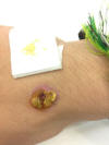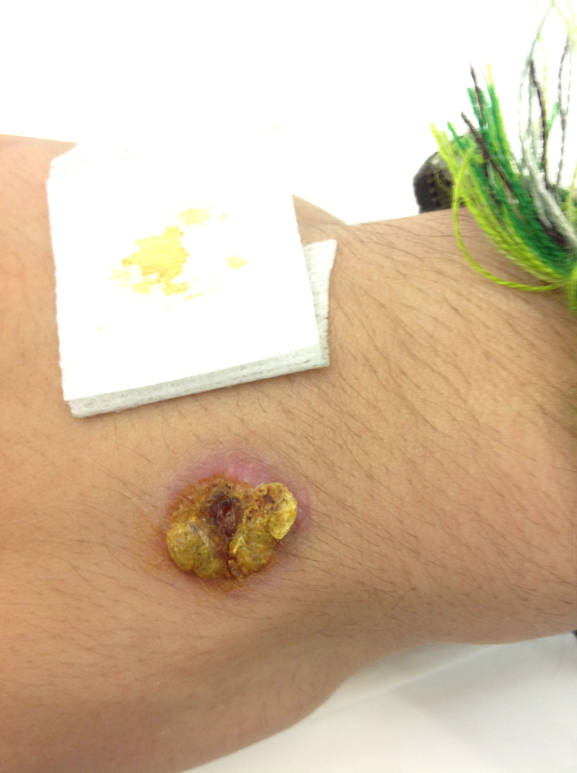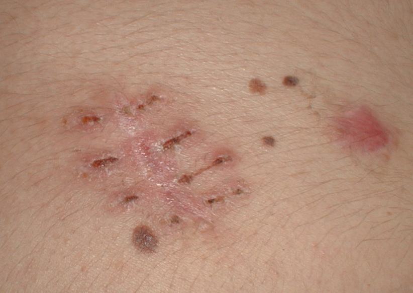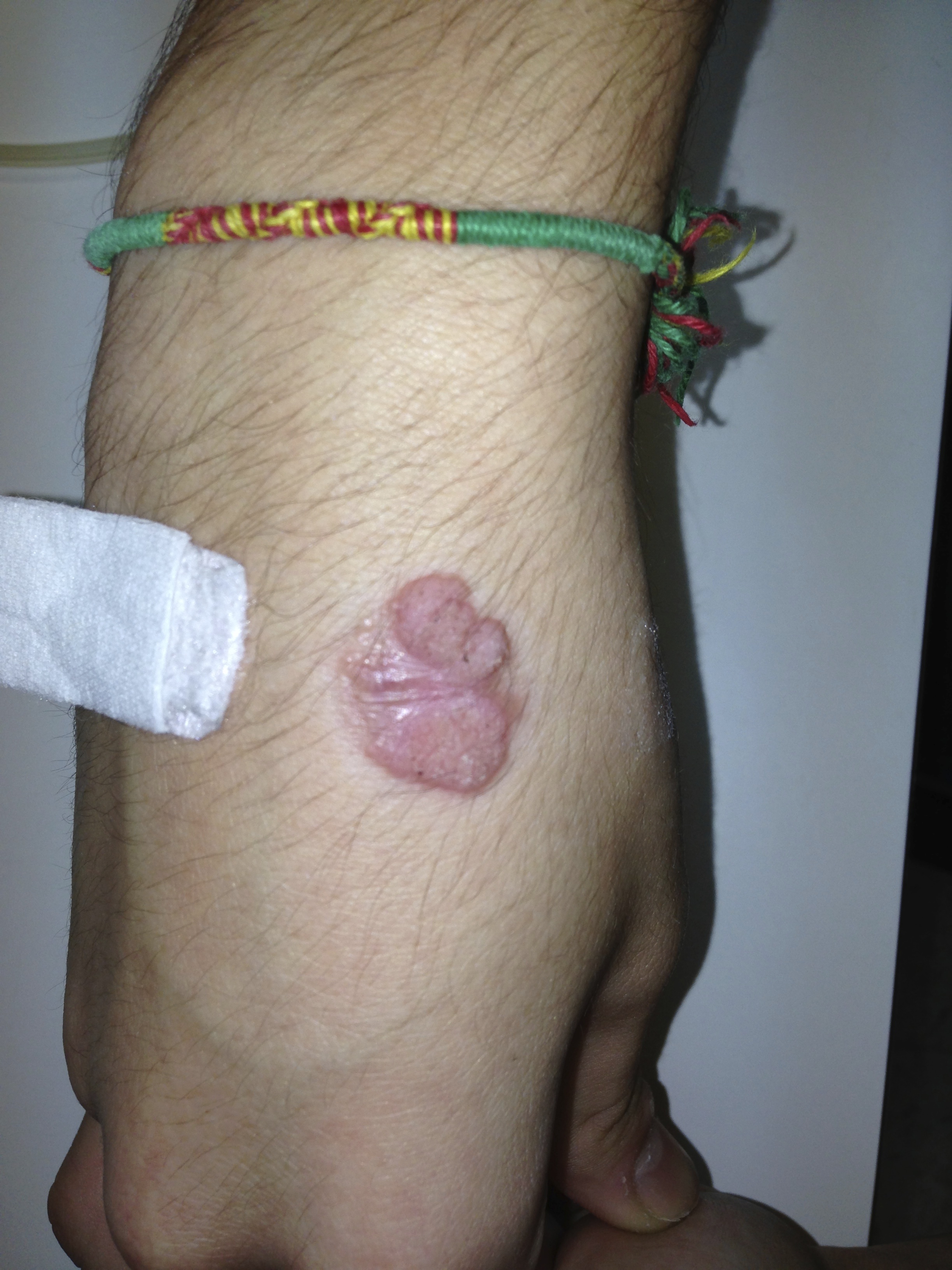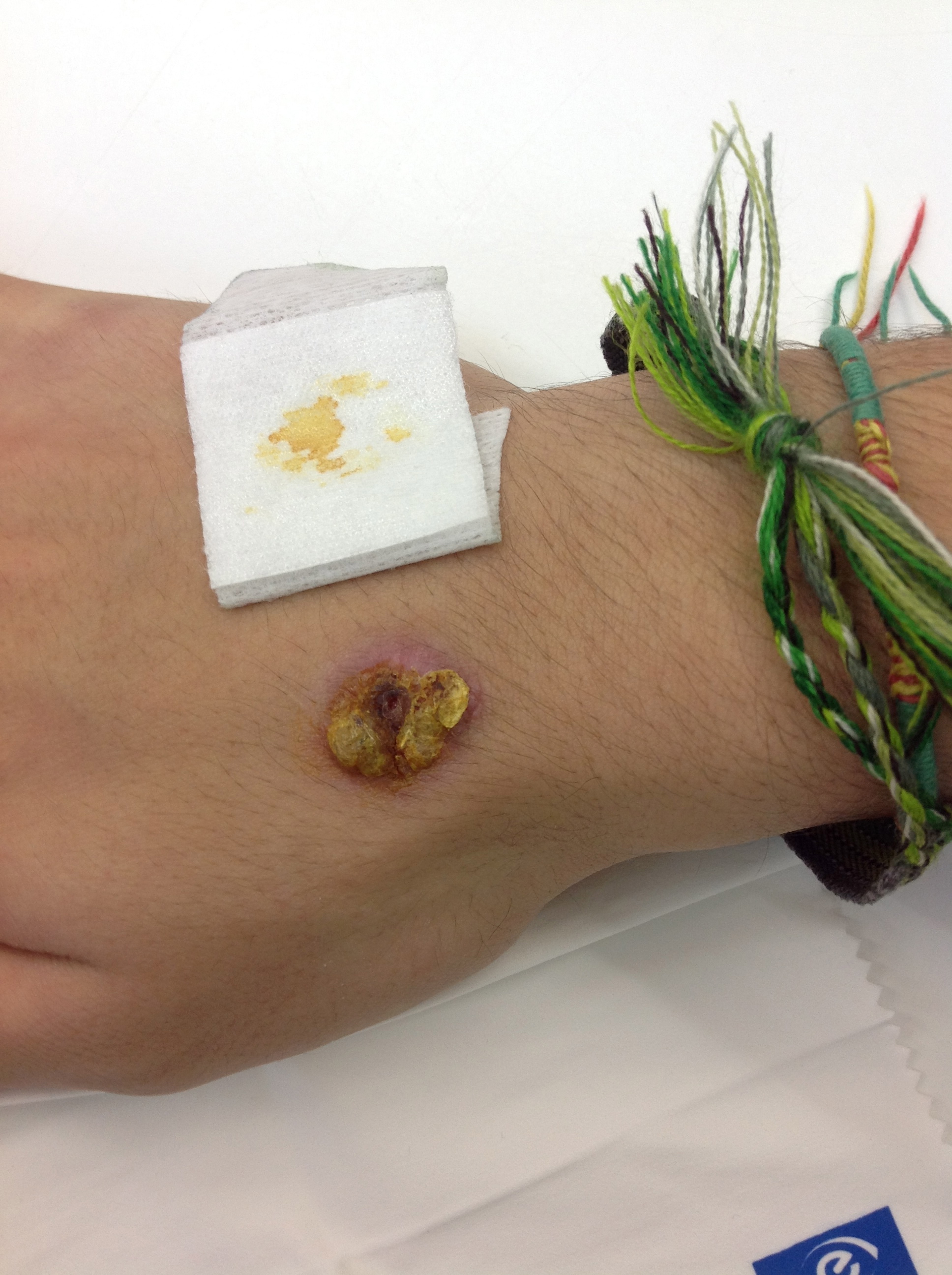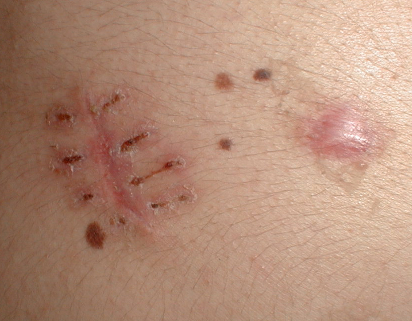 Exéresis de un nevus en la espalda de un joven de 22 años. Se practicó sutura con puntos en U transversales. La fuerza con que se anudaron los puntos resultó excesiva, y en el momento de retirar los puntos (7º día) los hilos habían penetrado profundamente en la piel produciendo cuatro heridas transversales a la herida suturada.